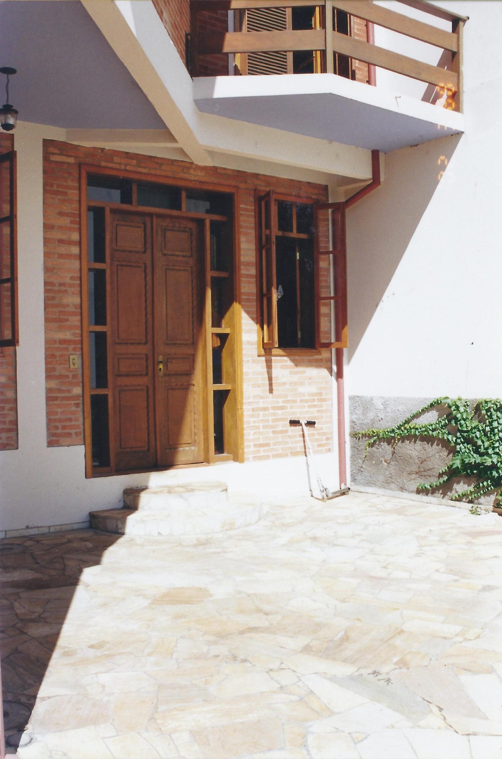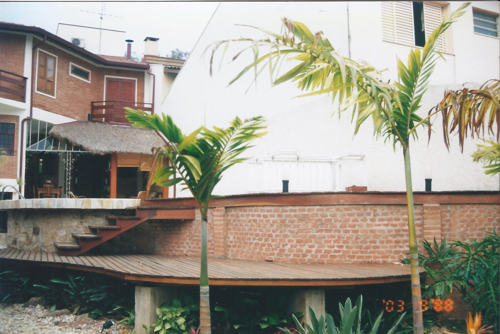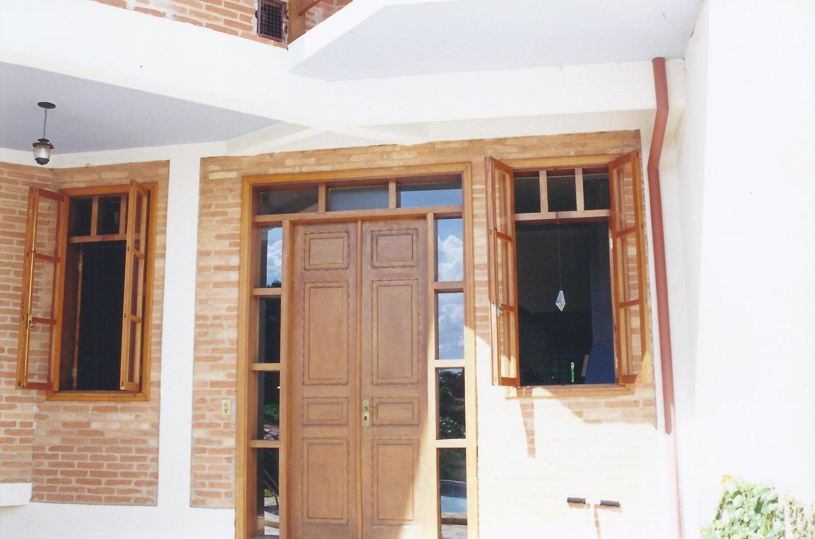 A comunicação entre interior da residência, e área da piscina e jardim, acontece por essa porta em madeira. Além da incidência do sol já assinalada, e em momentos de chuva, também gera um desconforto pela falta de uma cobertura, ou mesmo um beiral que pudesse dar uma forma proteção.