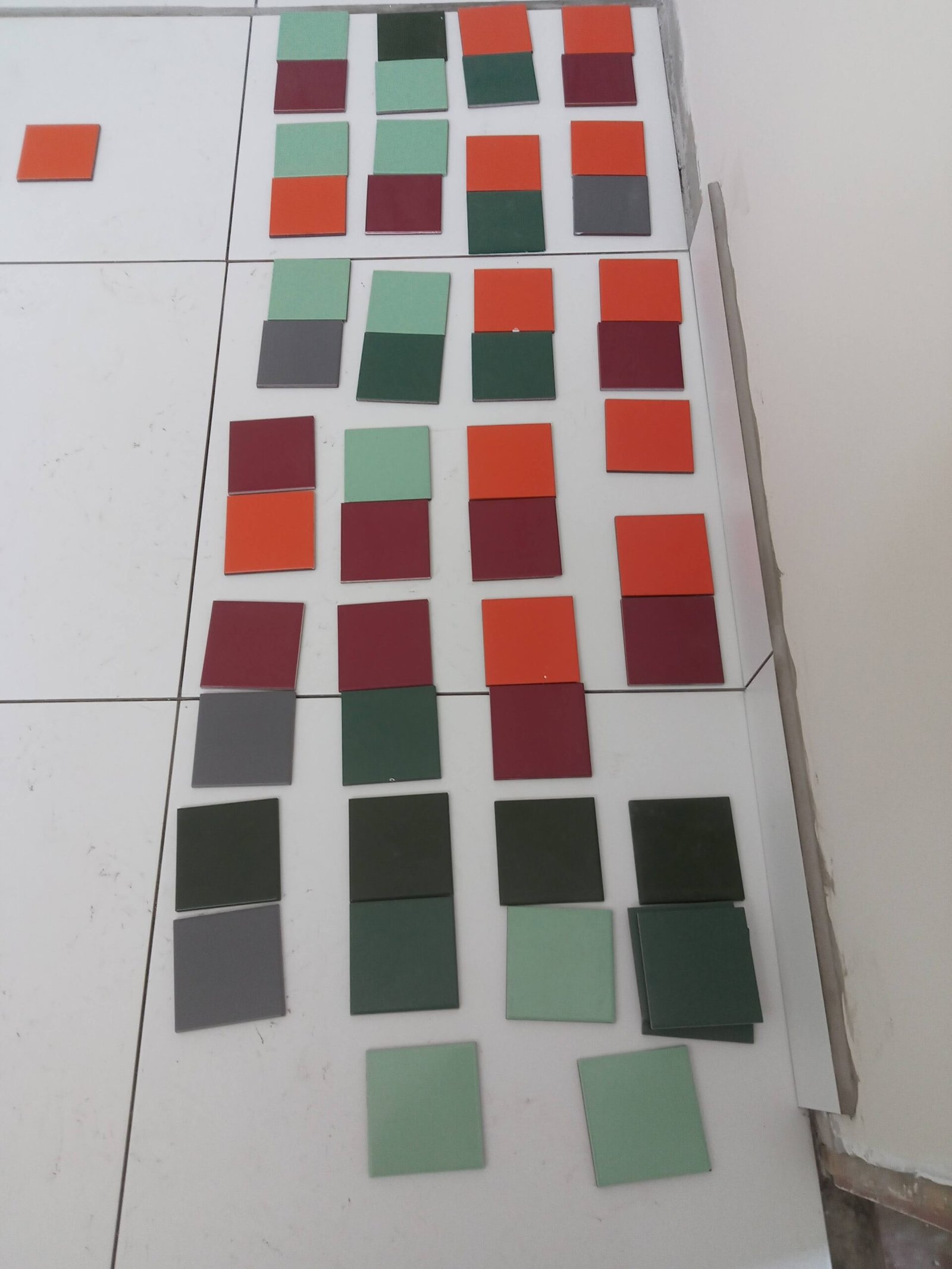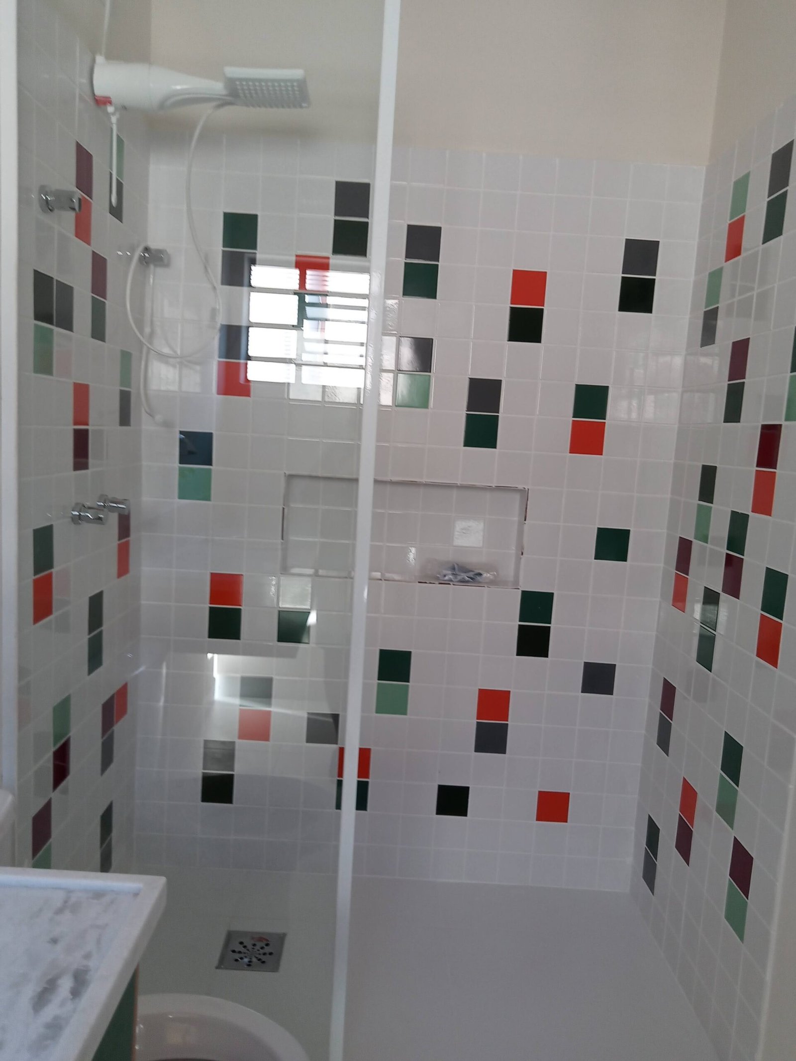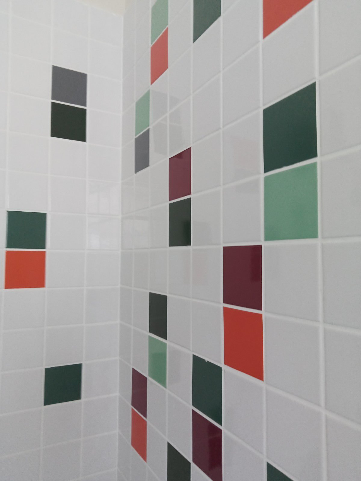 Essa paginação de azulejos brancos e coloridos, só foi possível por conta da escolha de um único padrão de azulejos, (10×10) permitindo essa composição cromática, sendo paredes totalmente brancas, e outras com composição de cores.