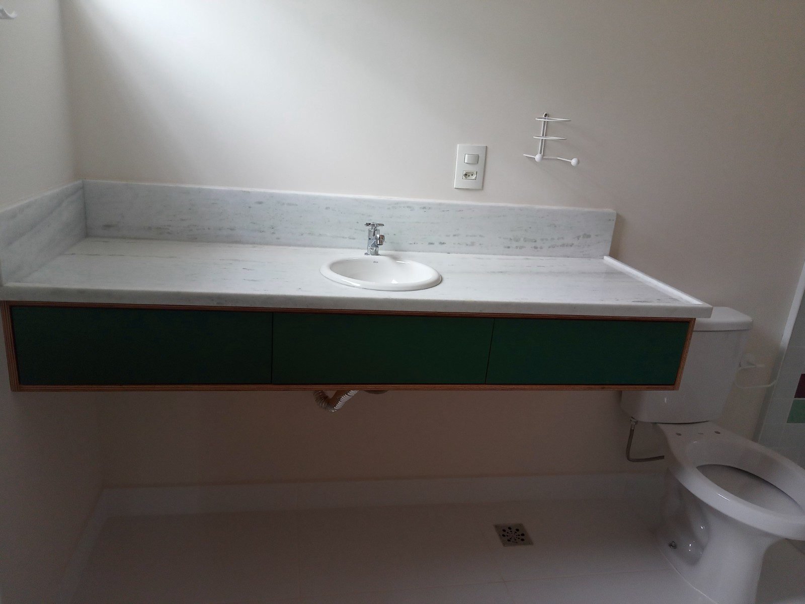A escolha da bancada em mármore branco pinta verde, também resultou de uma escolha estética, e ainda validada pelo custo mais reduzido, se comparado a outras opções em mármores, ou ainda granito. Ainda sobre a funcionalidade, o acabamento da borda de contenção na bancada de mármore, foi escolhido o perfil reto, para evitar a queda da água sobre mobiliário e piso.