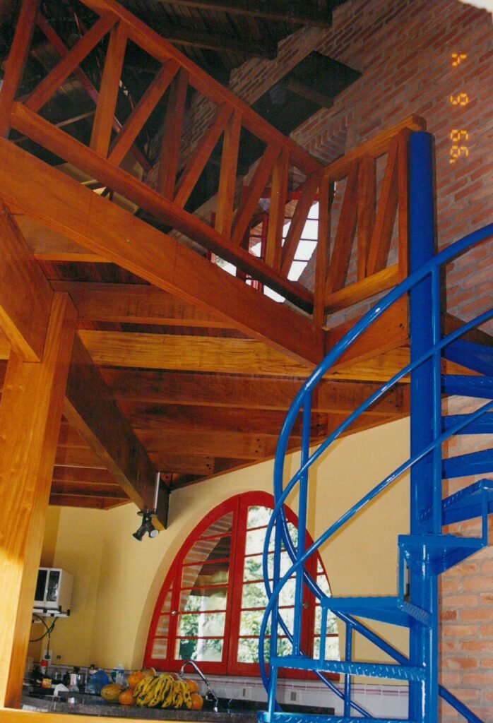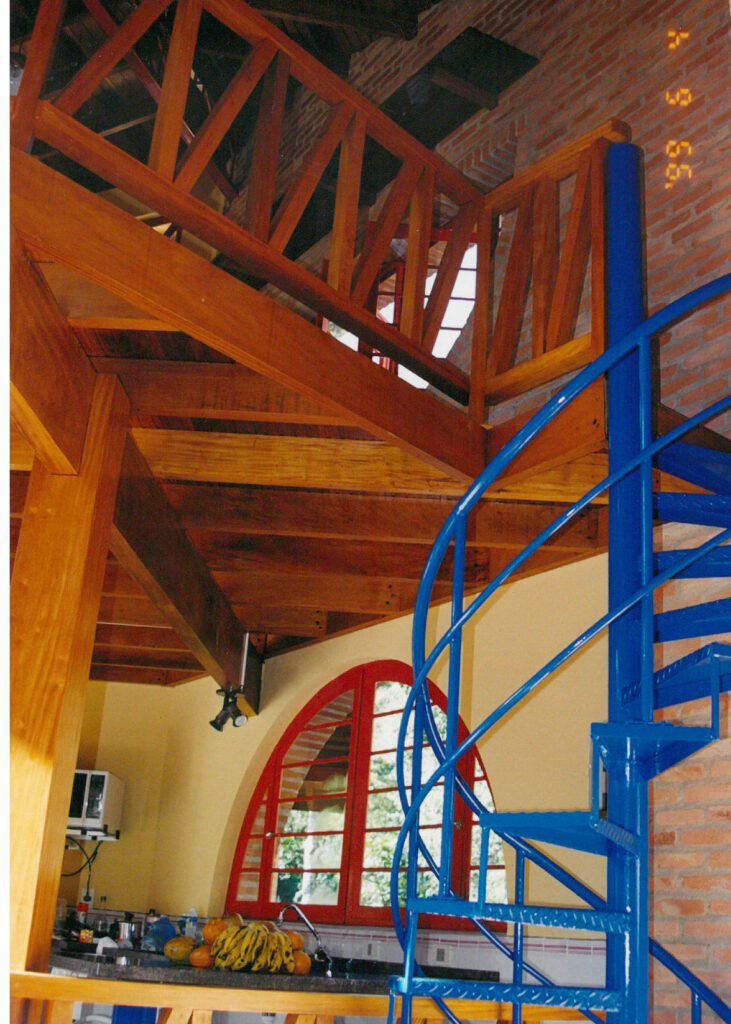 Elevada sob pilotis sobre um terreno que tem inclinação de 45 graus, a residência tem sala de estar integrada com cozinha e sala jantar, lavabo e suíte no primeiro plano. Por uma escada caracol, permite acesso ao mezanino, local servindo como dormitório, e relaxamento.