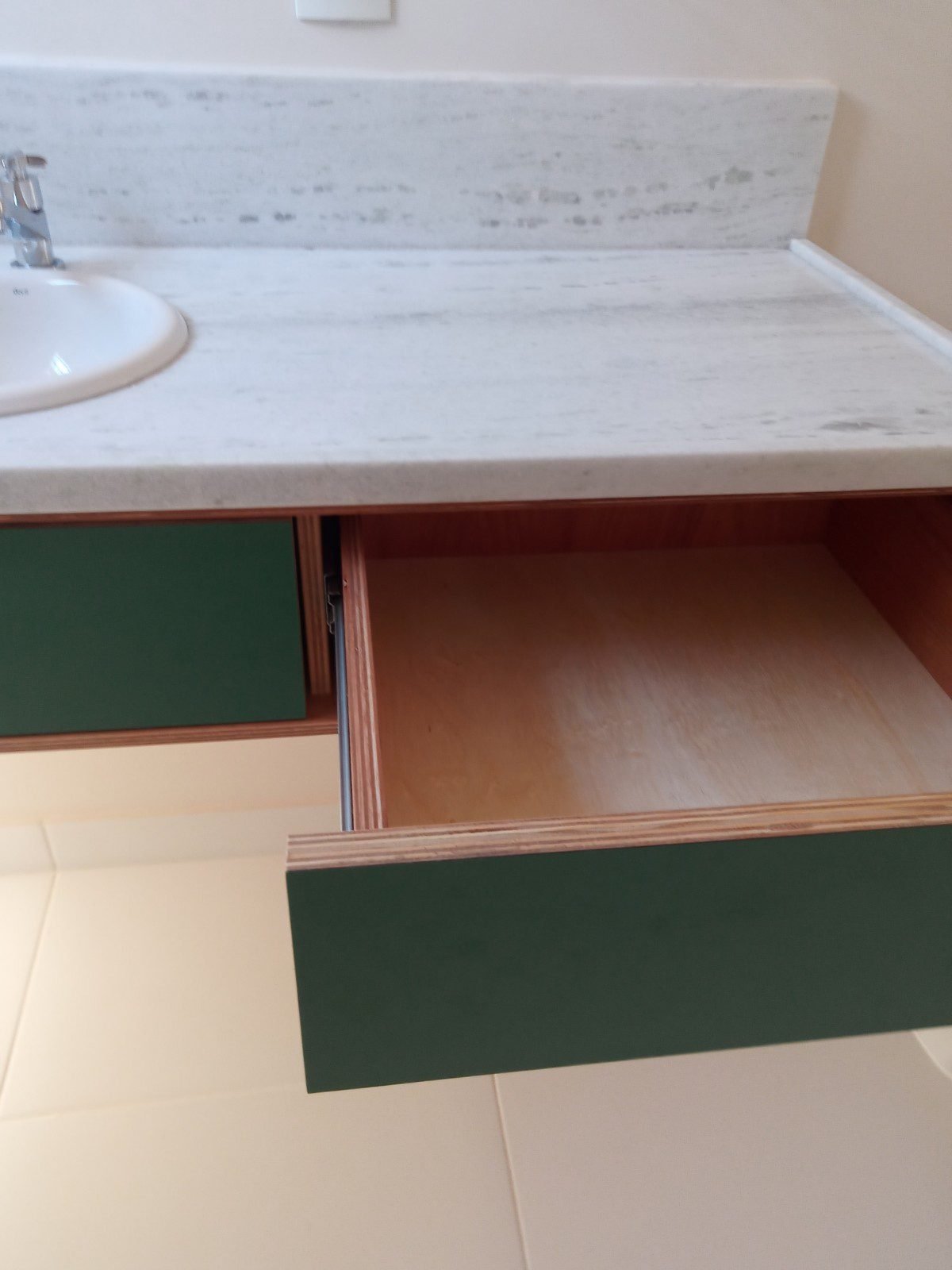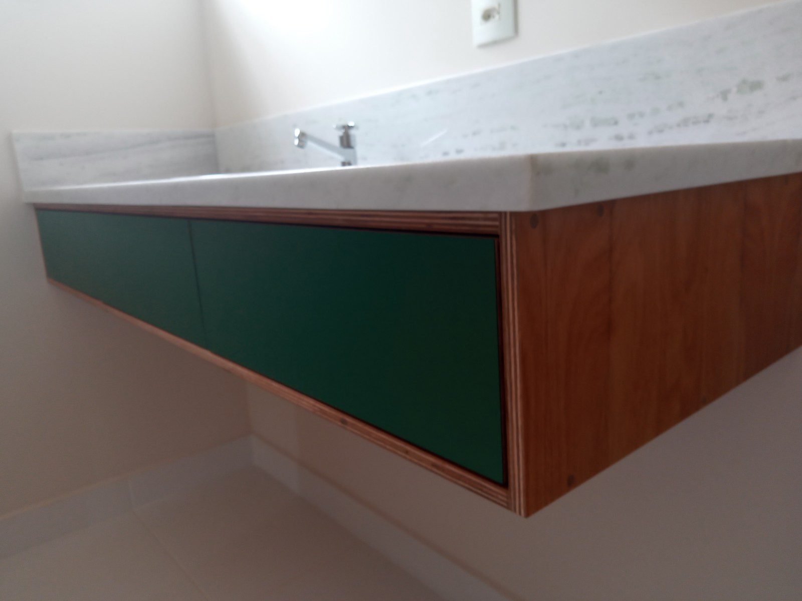 Sobre o Compensado, foi colado uma peça de formica na cor verde, dando acabamento e ainda, um destaque cromático.